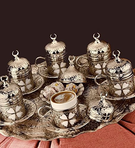 27 Pieces Turkish Greek Coffee Espresso Set for Serving - Porcelain Cups with Tray and Saucers - Vintage Tulip Design Ottoman Arabic Gift Set, Silver, hopefully can help you in buying the product.